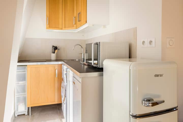 L'intérieur du studio est optimisé pour offrir un espace fonctionnel et confortable. Il comprend une cuisine ouverte, entièrement équipée, qui permet de cuisiner tout en profitant de la vue sur l'extérieur. La cuisine est moderne et bien agencée, avec des placards de rangement, des appareils électroménagers intégrés, et un plan de travail pratique.