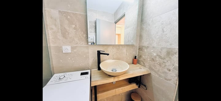 Profitez d’une belle douche spacieuse, d’une vasque avec miroir lumineux, d’un sèche-serviettes, d’un sèche-cheveux, et d’un lave-linge. Les WC sont séparés pour plus d’intimité.