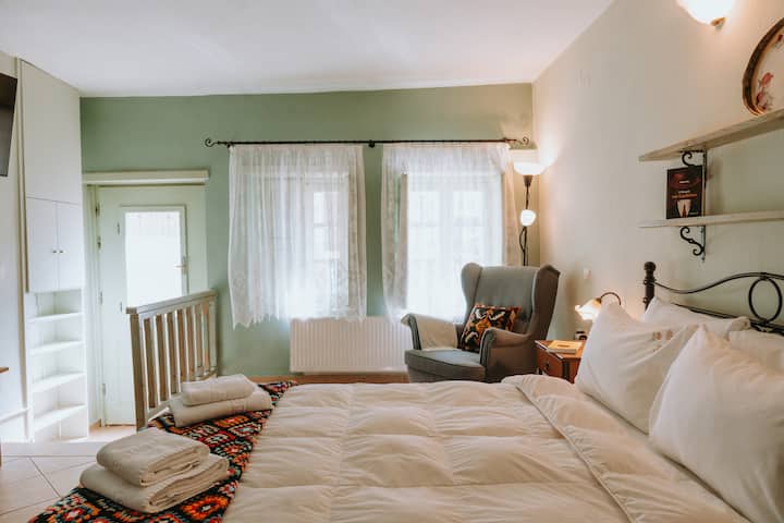Bienvenue dans un endroit fait avec amour, inspiré par la chaleur et l'authenticité de l'ancienne hospitalité de l'Épire. Ici, le sens de la familiarité est combiné au souci du détail, créant un environnement confortable et accueillant, comme si l'on retournait dans une maison familière avec les racines et l'âme. La chambre est lumineuse, attentionnée et entièrement équipée, idéale pour se reposer et travailler à distance. Il dispose d'un lit double confortable, de linge de lit et de serviettes, d'une télévision de 45 pouces, d'une connexion Wi-Fi rapide, de la climatisation, du chauffage et d'une salle de bain privée avec douche, gel douche, shampoing, serviettes et sèche-cheveux. Pour ceux qui veulent une obscurité totale, nos volets traditionnels assurent un sommeil paisible et réparateur. La cuisine offre tout ce dont vous avez besoin - petite cuisine, micro-ondes, réfrigérateur, cafetière expresso, ustensiles, assiettes et verres, grille-pain, bouilloire - pour que vous vous sentiez comme chez vous. La table et les chaises sont adaptées aux repas et au travail, et il y a des prises de courant près du lit et dans la zone de travail. Un fer à repasser est également fourni pour vos besoins pratiques.