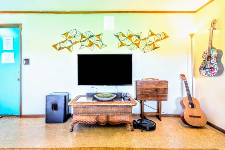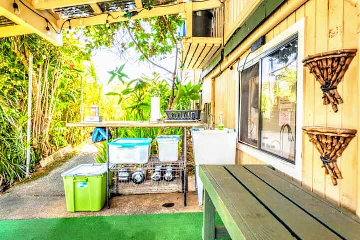 The Hamakua Guesthouse est un éco-lodge rustique hors réseau situé à l'extrémité sud de la jungle à couper le souffle d'Hawaï, la forêt tropicale de Hamakua Coast, à proximité de Hilo. Nous offrons cette chambre avec deux lits queen et vue sur le jardin. Nous avons deux cuisines partagées équipées pour votre usage et vous pouvez utiliser l'une de nos trois salles de bain complètes partagées (situées hors du couloir). Notre propriété dispose également d'une zone de baignade privée avec cascade à votre disposition.
