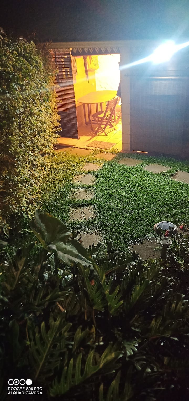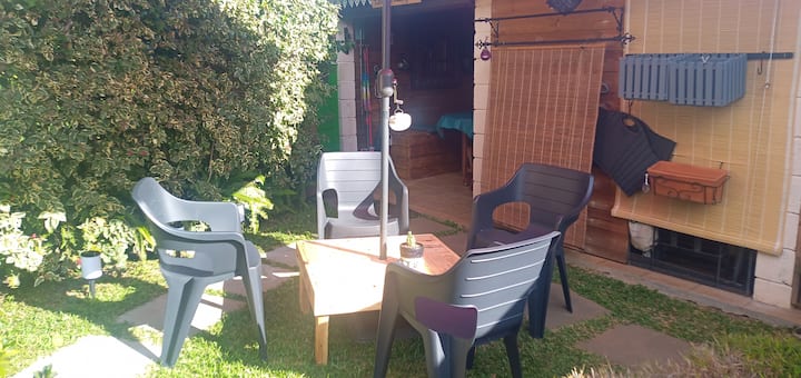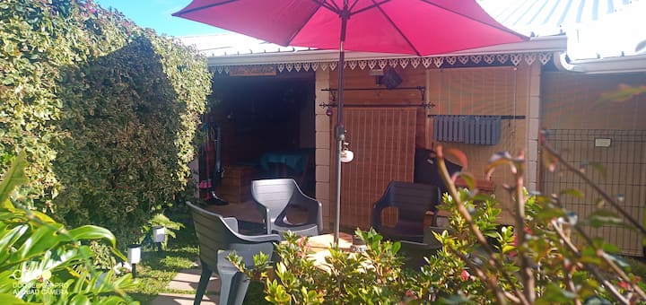 Depuis un petit jardin, vous entrez par une cuisine extérieure couverte, équipée pour vos repas et petits déjeuners : Evier, réfrigérateur, four micro-ondes, cafetière filtres, grille-pains, bouilloire électrique, 2 feux au gaz, ustensiles de cuisine courants, placards de rangements pour denrées alimentaires, marmites, poêles, casseroles, vaisselle pour 4, une table, chaises et bancs pour partager vos repas ensemble, etc.