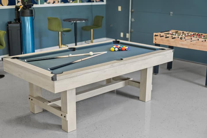 Garage converti en salle de jeux avec table de billard, baby-foot et borne d'arcade