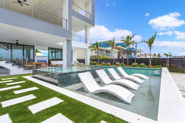 Ce tout nouveau domaine de 6 chambres et 6 salles de bain est tout simplement à couper le souffle. Dès votre arrivée, vous succomberez sous sa grandeur : un magnifique chef-d' œuvre architectural de trois étages sur la magnifique toile de fond de Fort Myers Beach. Avec un garage pour voitures multiples doté d'un chargeur Tesla EV, d'une vaste allée et d'un terrain luxuriant et aménagé professionnellement avec un vaste éclairage extérieur LED et paysager, cette maison offre un attrait instantané sur le trottoir et une première impression inoubliable.