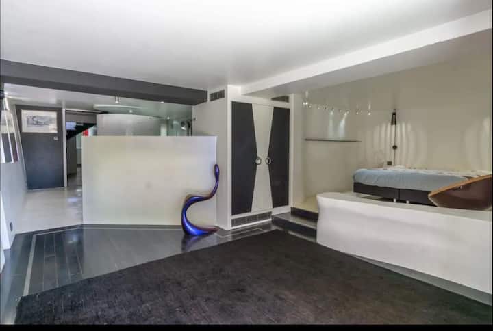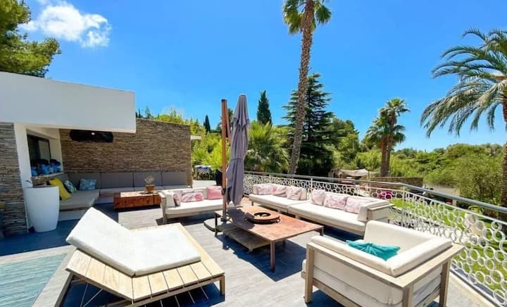 Vous serez accueillis par un spacieux salon/salle à manger. Pour assurer votre confort une terrasse de 250m2 surplombent la piscine et sa végétation luxuriante