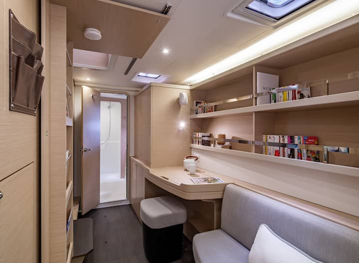 Cuisine entièrement équipée – Cuisinez facilement à bord en utilisant la cuisine bien équipée, dotée d'une cuisinière, d'un four, d'un réfrigérateur, d'un congélateur et de nombreux rangements pour les trouvailles du marché sicilien.