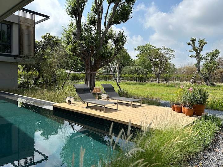 🌿Ruene Ymlap est un logement moderne de style loft niché près d'un canal tranquille à Ayutthaya. Le rez-de-chaussée est un espace de vie ouvert avec un salon confortable, une piscine privée et un grand jardin parfait pour les promenades matinales et les moments de calme dans la nature. La maison est entourée d'arbres et d'espaces verts paisibles, avec un stationnement privé.