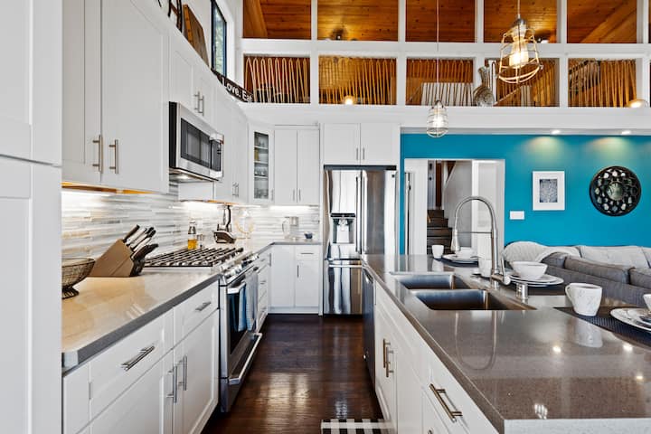 Cette maison spacieuse de cinq chambres et trois salles de bain offre confort, commodité et une touche de nautisme. En entrant par la porte rouge vif, vous serez accueilli par des caractéristiques uniques comme un escalier divisé et des détails de corde ludiques inspirés du capitaine Jack Sparrow.