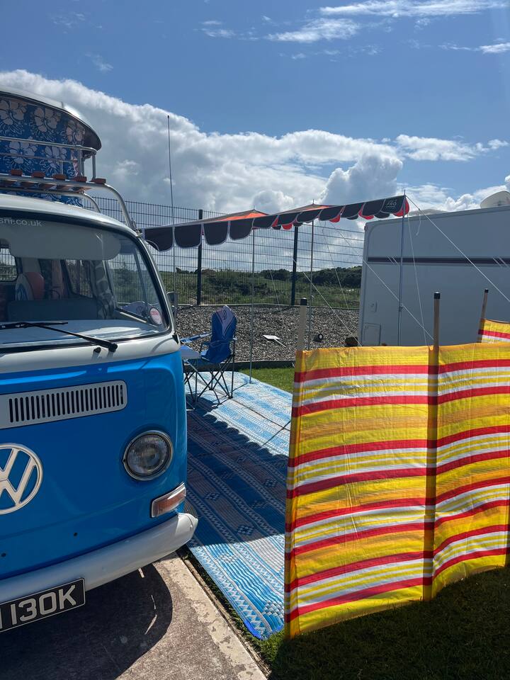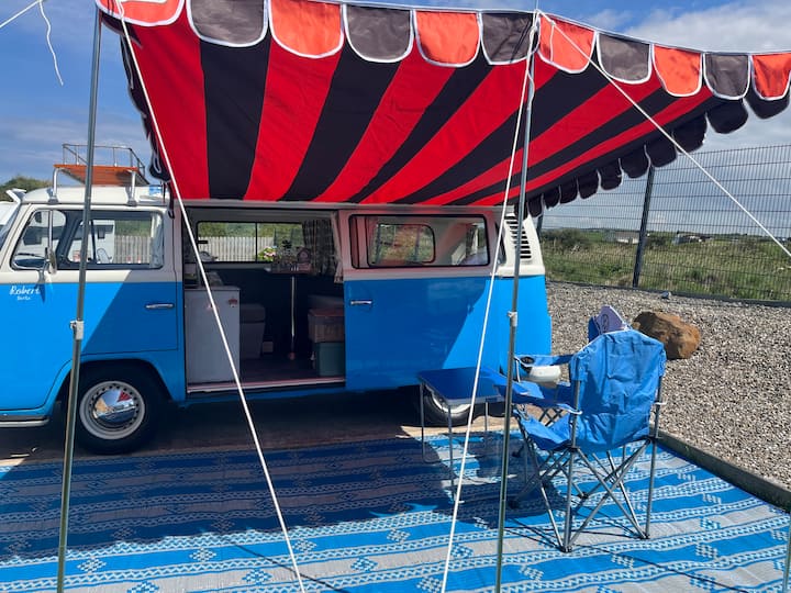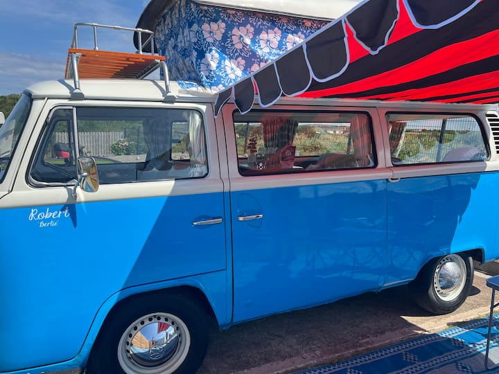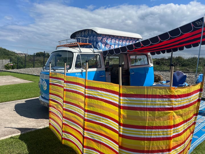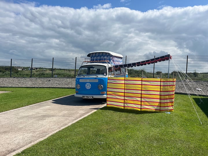 Rencontrez Bertie, notre charmante autocaravane vintage VW T2 Bay Window, installée en permanence au pittoresque Causeway Coast Touring Park — pas besoin de conduire!