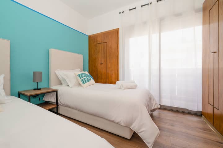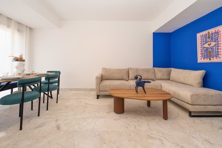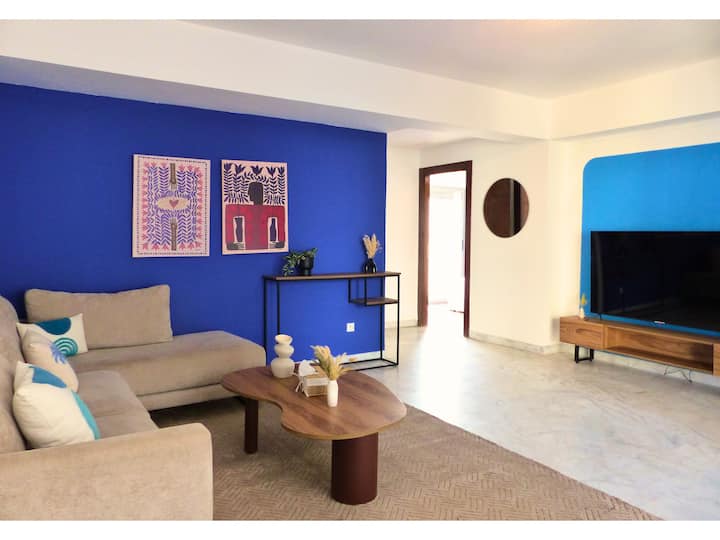 L'appartement n°9, baigné d'une palette de bleus subtils, vous transporte dans une atmosphère apaisante