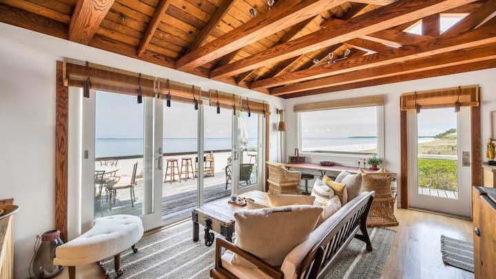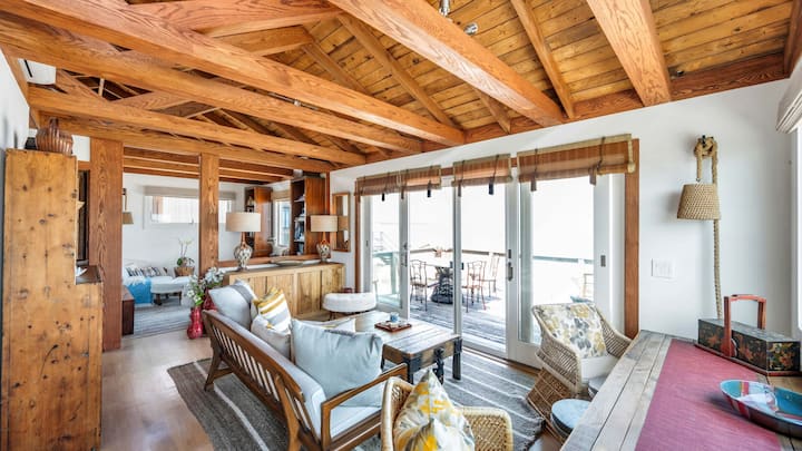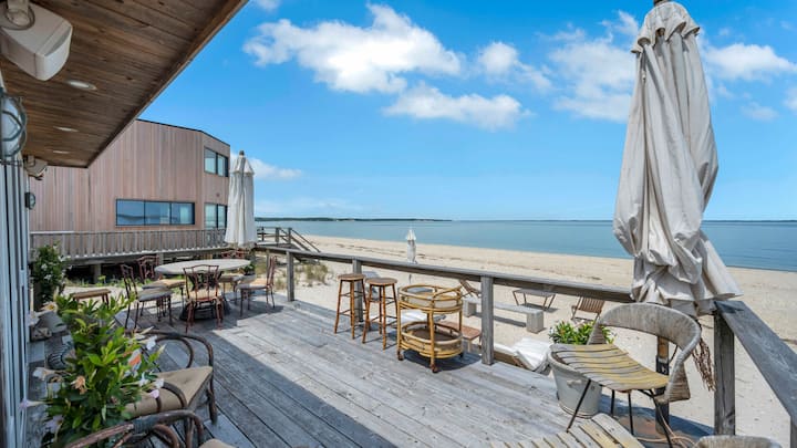 Nichée sur les rives immaculées de la baie de Peconic à Southampton, cette maison chic et rustique au bord de l'eau offre un mélange rare de luxe discret et de beauté naturelle. Idéalement situé pour l'intimité et la commodité, les voyageurs se retrouveront dans une escapade de rêve où le rythme apaisant des vagues donne le ton à chaque moment de la journée. Cette retraite de deux chambres et une salle de bain avec un espace de bureau supplémentaire est conçue pour embrasser la beauté de son environnement avec une vue panoramique imprenable sur l'eau de chaque pièce. La maison invite les voyageurs sophistiqués à ralentir, à respirer profondément et à se livrer à un style de vie tranquille en bord de mer, tout en étant à quelques minutes du cœur du centre-ville animé de Southampton, des plages de classe mondiale et des restaurants renommés.