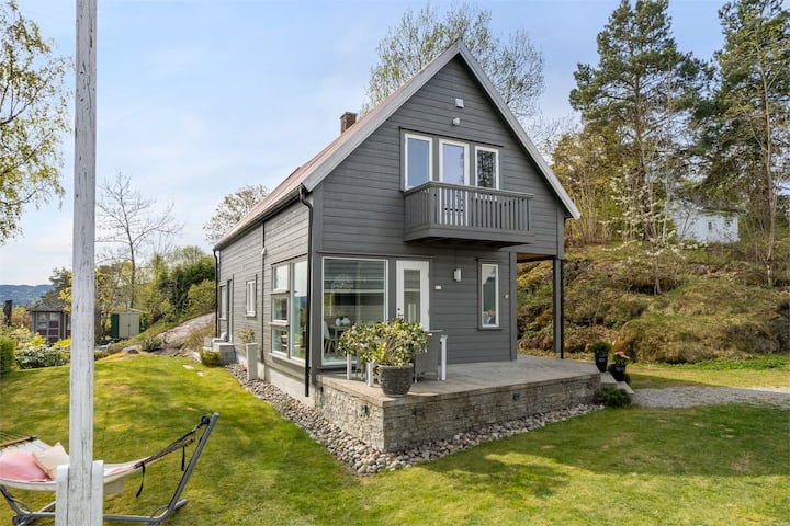 4 chambres (6 couchages), salon spacieux avec cheminée, cuisine équipée avec vue. Grand jardin ensoleillé, terrasse et balcon privé avec vue sur le fjord.