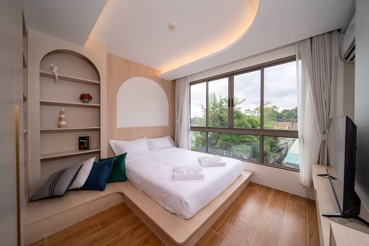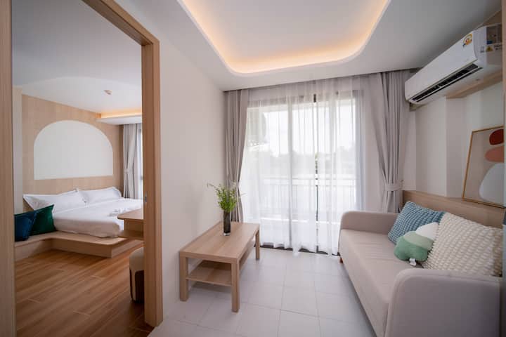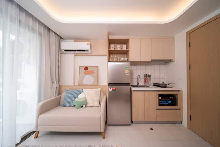 Appartement d'une chambre à coucher de style japonais avec piscine, salle de sport, cuisine, salon, ustensiles de cuisine, vaisselle, sécurité 24h/24