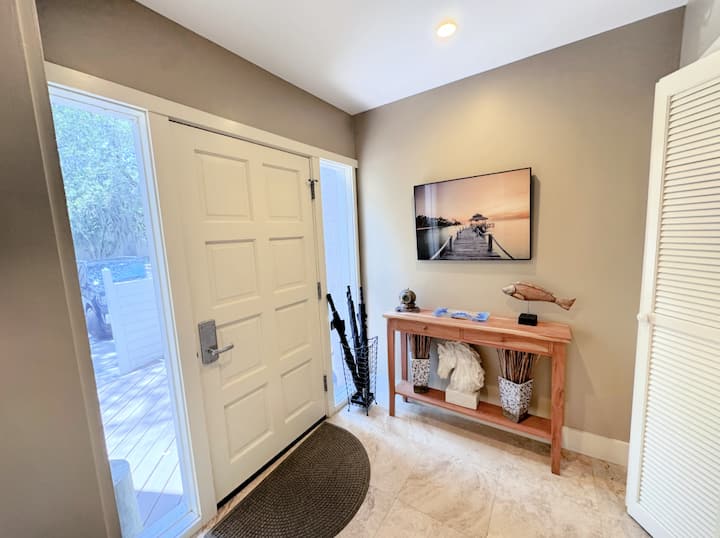 Le rez-de-chaussée s'ouvre sur une terrasse ensoleillée en composite qui donne sur une cour arrière tranquille et verdoyante, idéale pour prendre un café, dîner en plein air ou simplement profiter de l'environnement paisible. La chambre à coucher en mezzanine à l'étage comprend un lit « king size » et une salle de bain privée. Les autres options de couchage et la demi-salle de bain au rez-de-chaussée permettent à cette maison de ville d'accueillir confortablement jusqu'à six voyageurs. Une buanderie privée ajoute à la commodité, et les rénovations de bon goût s'étendent à toute la propriété, des nouvelles allées en asphalte à l'aménagement paysager estival éclatant.