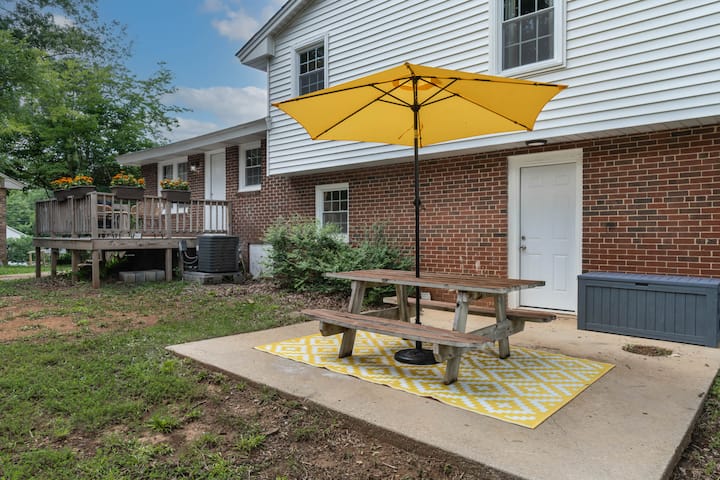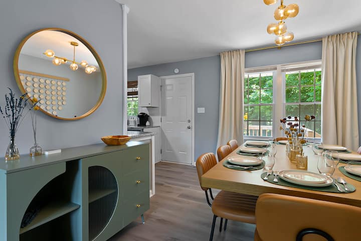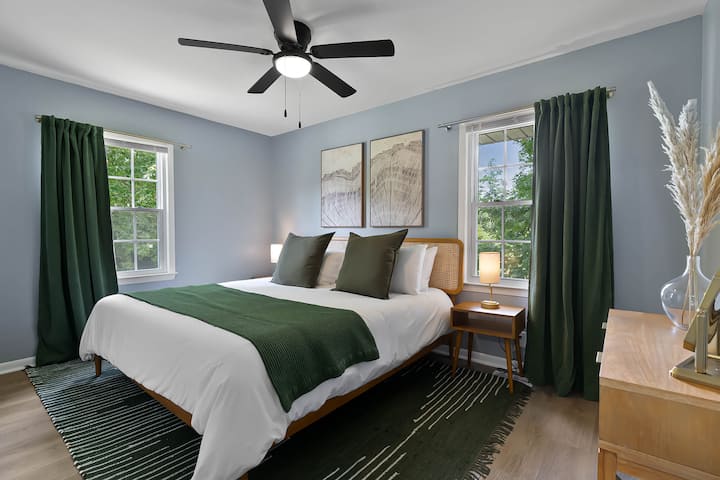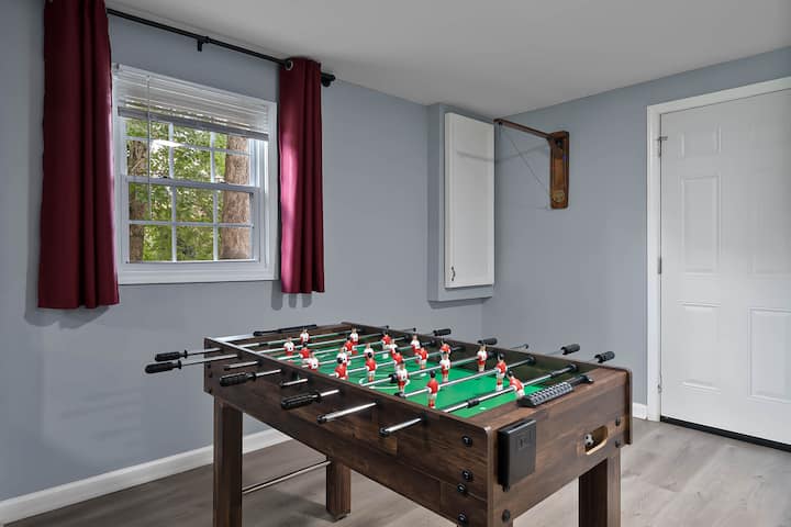 Bienvenue dans votre escapade familiale idéale ! Détendez-vous dans une maison confortable qui peut accueillir 7 personnes et qui dispose de deux lits « king size », avec une cour spacieuse dans un quartier paisible. Profitez des soirées autour d'un foyer à bois unique, ou défiez votre équipe au baby-foot, aux jeux de table et au lancer d'anneaux dans la salle de divertissement avec télévision. Vous voyagez avec des enfants ? On a un parc pour bébé! Commencez la journée avec du café, de la crème et du sucre à portée de main. Tout est là, il ne vous reste plus qu'à vous amuser et à vous sentir chez vous.