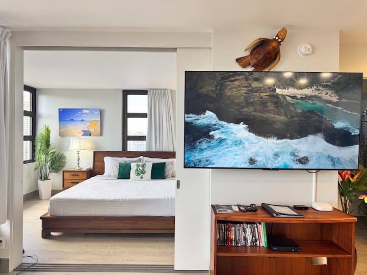 Aloha et bienvenue à l'unité 2502 dans la tour 2 du Waikiki Banyan — votre coin de paradis privé avec une vue imprenable sur l'océan depuis le 25e étage! Que vous sirotiez un café au lever du soleil ou que vous dégustiez un cocktail au coucher du soleil sur le lanai, la vue sur l'océan Pacifique et la ligne d'horizon de Waikiki est tout simplement inoubliable. Condo d'une chambre avec un canapé-lit queen-size dans le salon et un lit king-size dans la chambre.
