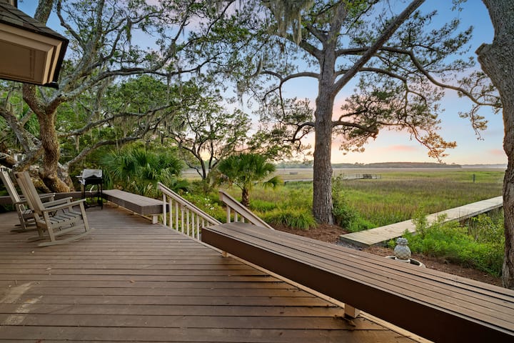 À l'extérieur, de généreuses terrasses vous invitent à profiter du café du matin dans un cadre serein ou à vous détendre avec un verre de vin tout en vous imprégnant de l'ambiance paisible et des belles couleurs d'un coucher de soleil sur l'île de Seabrook au-dessus du marais. Écoutez l'appel des oiseaux rares et de la faune.