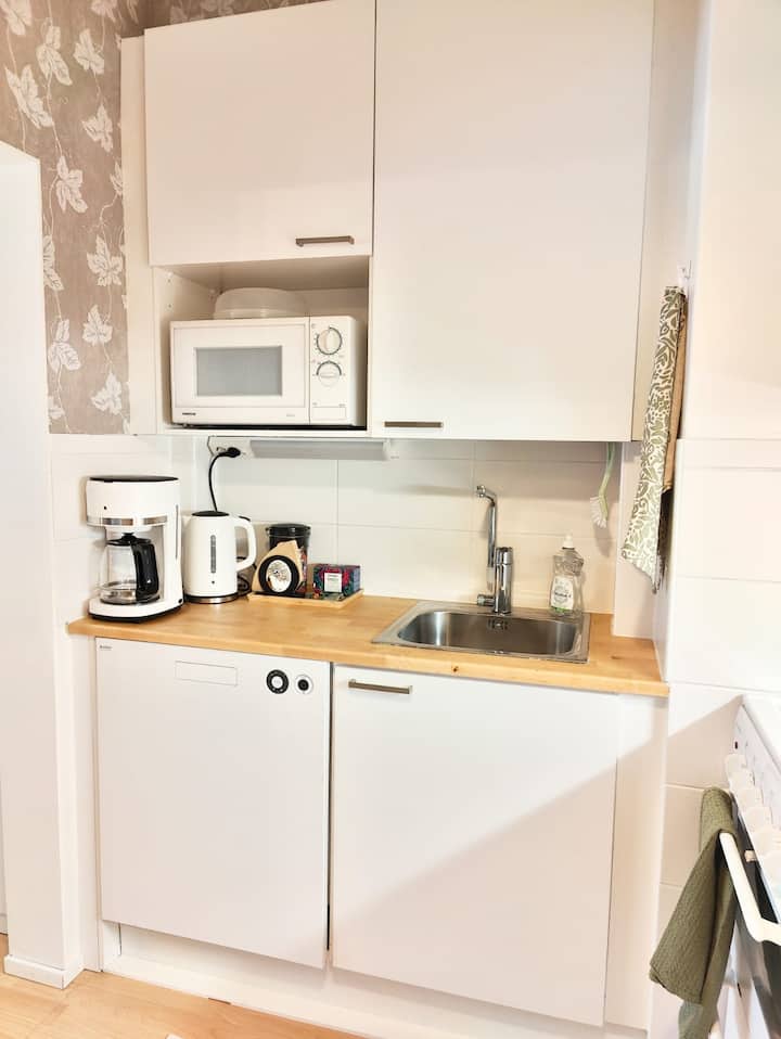 La cuisine est une cuisine maison entièrement équipée. Il y a un lave-vaisselle et d'autres petits appareils de cuisine communs comme une cafetière, une bouilloire électrique, un grille-pain et un micro-ondes. Que vous souhaitiez cuisiner ou manger une nouille chic, vous trouverez ce dont vous avez besoin. Du café, du thé, de l'huile, des flocons d'avoine, de la farine et de la plupart des épices courantes sont disponibles dans l'armoire.