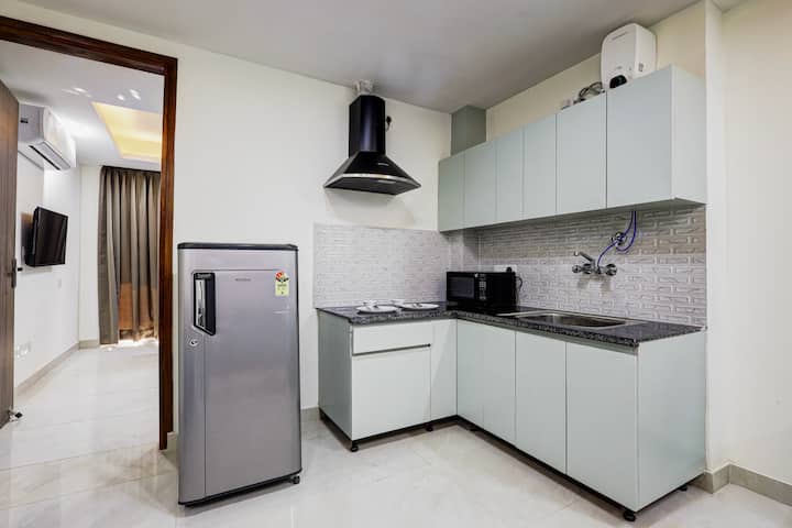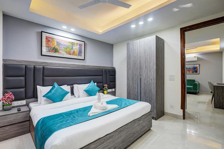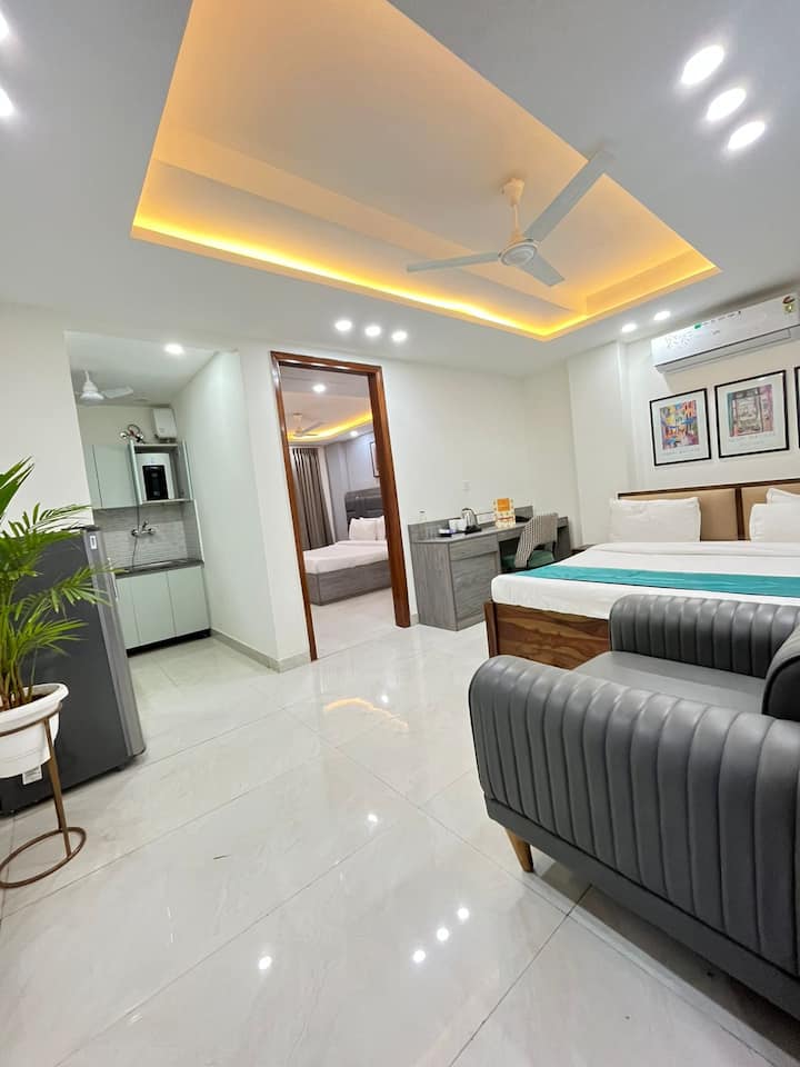 Il s'agit d'un appartement 1 BHK soigneusement conçu, mis à niveau en suite familiale pour plus de confort. En plus de la chambre privée, on a placé un deuxième lit king-size dans le salon, ce qui le rend idéal pour les familles ou les groupes qui ont besoin d'espace de couchage supplémentaire sans compromettre le confort ou l'intimité.
