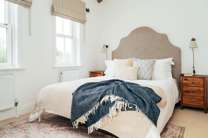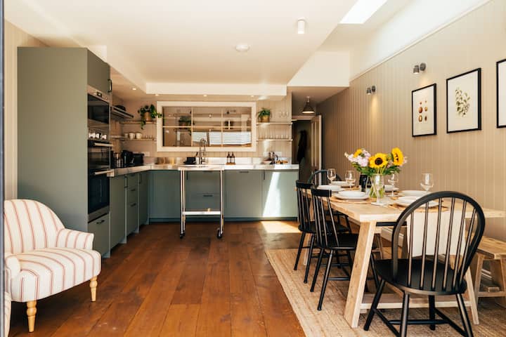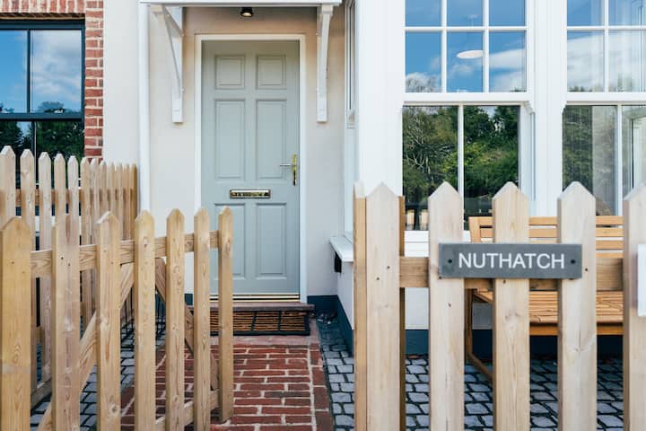 Nuthatch a été soigneusement conçu pour combiner le style champêtre, contemporain et de caractère. Le confort moderne est mélangé à des pièces classiques, et une palette de couleurs neutres et de tons chauds inspirés des bois et de la rivière. L'ambiance chic champêtre comprend un salon lambrissé et un espace cuisine-salle à manger-salon baigné de lumière où des portes vitrées classiques Crittall s'ouvrent sur un jardin privé, ensoleillé et entouré de murs. Avec un barbecue, un foyer, une table et des chaises, c'est l'endroit idéal pour prendre un verre et manger en plein air.
