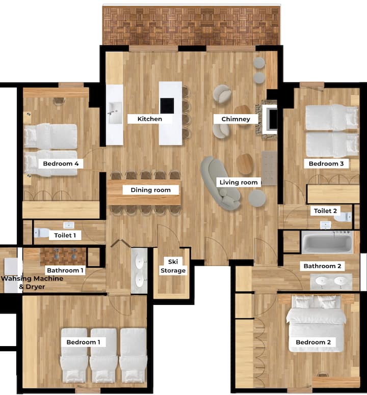 - 4 chambres (une avec lit double 160, 2 avec lits simples pouvant être réunis en lit double de 180, 1 avec lits simples et lits superposés,