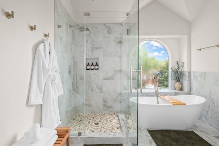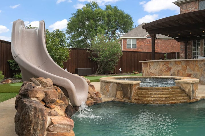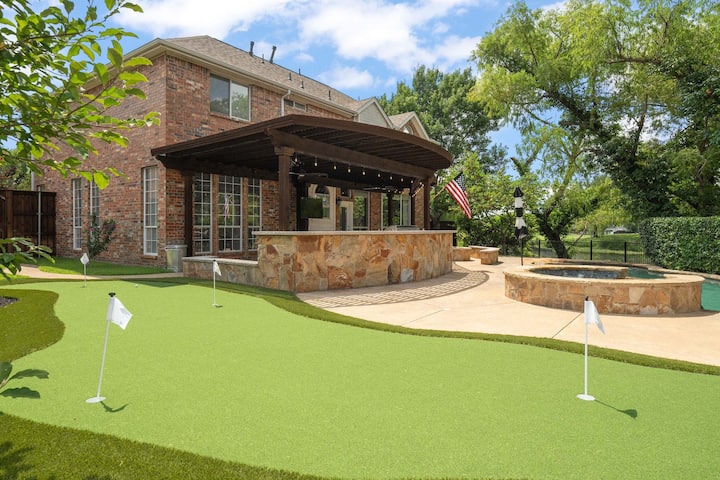 Piscine chauffée de style complexe hôtelier/spa, putting green, +