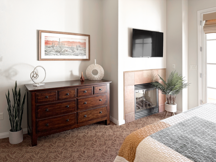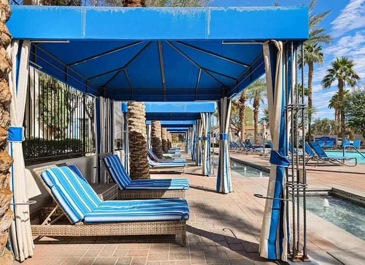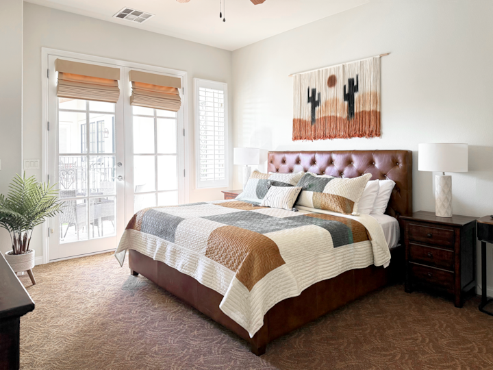 Chambre élégante avec lit « king size », balcon et vue sur la piscine