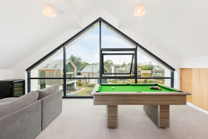 Le lodge, réparti sur trois étages, peut accueillir confortablement 10 personnes, avec 1 lit super-king, 2 lits king size, 4 lits simples et un canapé-lit supplémentaire disponible sur demande. Il y a un spa privé donnant sur le lac, une salle de jeux avec une table de billard et la climatisation dans les chambres orientées vers le sud.