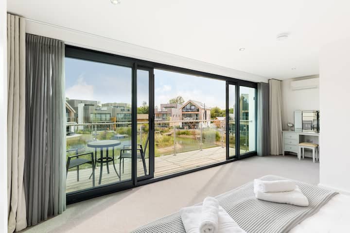 De retour dans le pavillon et à l'étage, il y a la chambre principale merveilleusement spacieuse, avec un lit de taille superking, avec air conditionné, télévision intelligente et grande salle de bain attenante. Le balcon peut accueillir deux personnes et offre une vue imprenable sur le lac Minety. Excellente façon de commencer la journée !