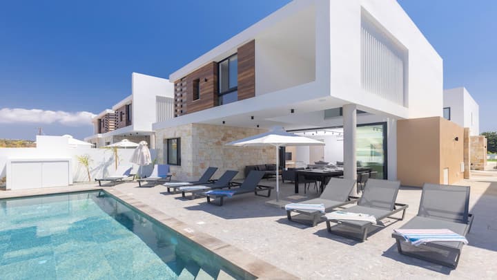 Cette villa de luxe et toute neuve de 4 chambres à coucher, sur 2 étages, est située dans un emplacement privilégié et central d'Ayia Napa, à seulement quelques minutes à pied de l'avenue Nissi et à seulement 1,2 kilomètre de la populaire plage de Nissi Bay. La villa est nouvellement construite et entièrement équipée avec des meubles et des équipements neufs et contemporains pour assurer un séjour confortable.