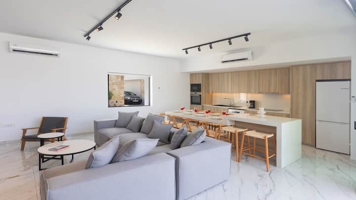 En entrant dans la villa, vous trouverez le salon spacieux et moderne à aire ouverte, la cuisine et la salle à manger, avec de grandes portes patio menant au jardin et à la piscine. Le salon est équipé d'un canapé d'angle confortable, d'une télévision connectée à écran large avec des chaînes satellite et d'une connexion Wi-Fi. La salle à manger dispose d'une table et de chaises pour 10 personnes, et la cuisine est entièrement équipée avec tous les appareils et ustensiles nécessaires pour un séjour agréable en autonomie. L'une des quatre chambres se trouve au rez-de-chaussée avec un lit double, et vous trouverez également l'une des salles de bains avec douche et WC.