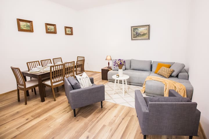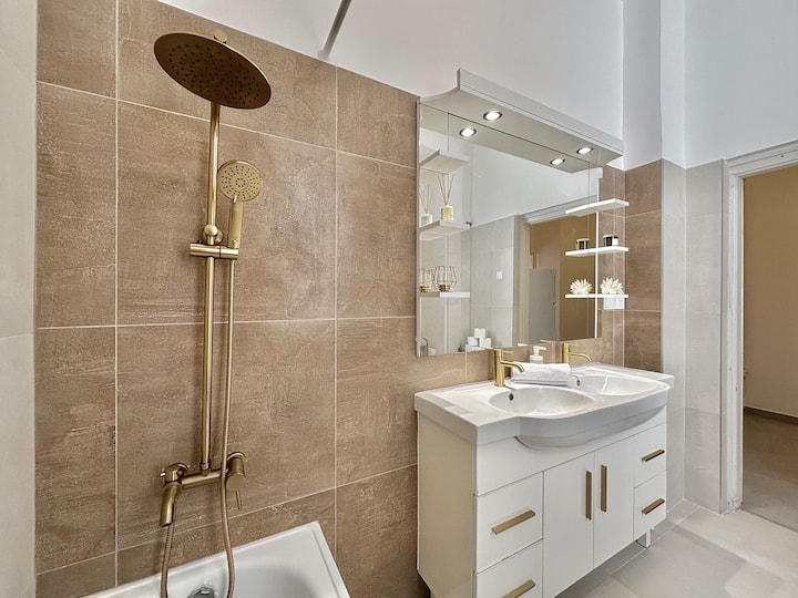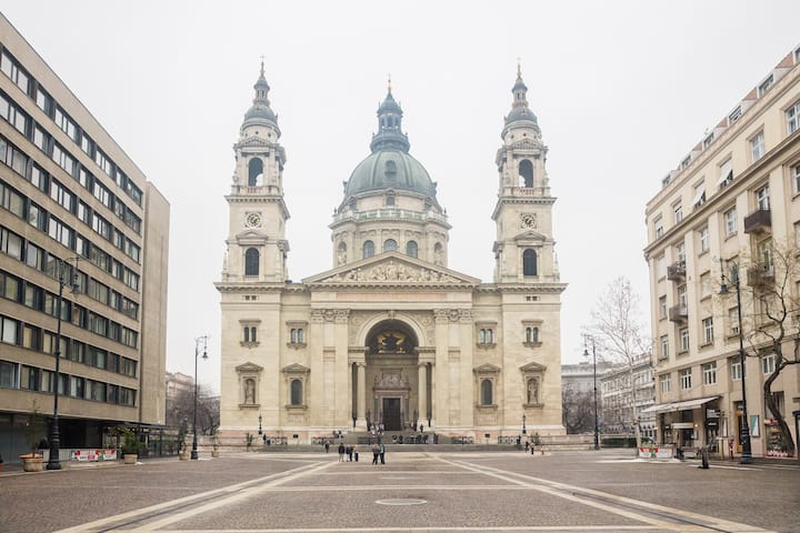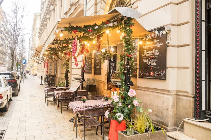 Séjournez dans notre maison historique au cœur de Budapest! Près de l'emblématique basilique Saint-Étienne et de la place Deák, à quelques pas de tous les principaux sites. Ce quartier central regorge de vie culturelle, de restaurants et de bars. Excellent accès aux transports - pas comme si vous en aviez besoin! 2 chambres avec lits Queen size, 1 chambre avec un lit King size. Salon spacieux avec un canapé-lit et une télévision. Cuisine complète avec lave-linge-sécheuse 2-en-1, cafetière et lave-vaisselle.