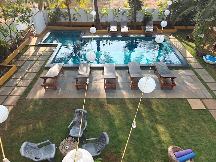Évadez-vous à SOLS Backyard, une villa privée 5BHK à seulement 200 m de la plage de Mandrem-Arambol, offrant une retraite exclusive pour les familles ou les groupes. Profitez de votre propre piscine, d'un jardin luxuriant et d'espaces entièrement privés, y compris cinq chambres climatisées avec salle de bain attenante et balcons. Détendez-vous dans les espaces de vie spacieux ou préparez des repas dans la cuisine bien équipée. Avec une connexion Wi-Fi haut débit et un emplacement serein près de la plage, SOLS Backyard est parfait pour une escapade inoubliable à Goan.