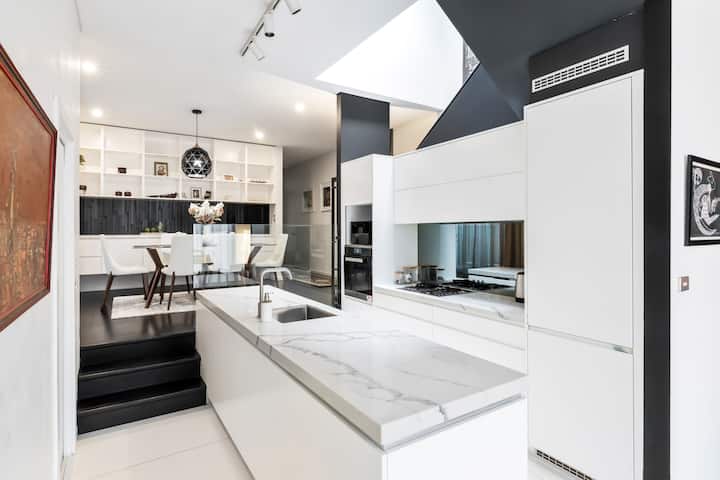 La cuisine gastronomique est à la fois fonctionnelle et élégante, avec un îlot élégant, une table de cuisson au gaz, une machine Nespresso, une presse française, un cuiseur à riz, un micro-ondes et tout ce dont vous avez besoin pour cuisiner à la maison sans effort. Juste au-dessus, la salle à manger surélevée invite à des repas détendus autour d'une table en verre, éclairée par une lumière suspendue sculpturale. À l'extérieur, la cour ensoleillée offre une retraite paisible avec une végétation luxuriante et des sièges extérieurs, parfaits pour le café du matin ou les repas en plein air.