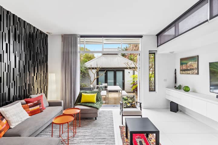 Une maison classique de style australien, rénovée avec style pour mélanger le charme original avec des intérieurs audacieux et design. Au centre de la maison se trouve un superbe salon à aire ouverte, avec des sièges moelleux, un mur noir spectaculaire et un accès direct à la cour verdoyante. Que ce soit pour regarder un film, se détendre dans le salon ou profiter de l'air frais, c'est un espace qui rassemble les gens.