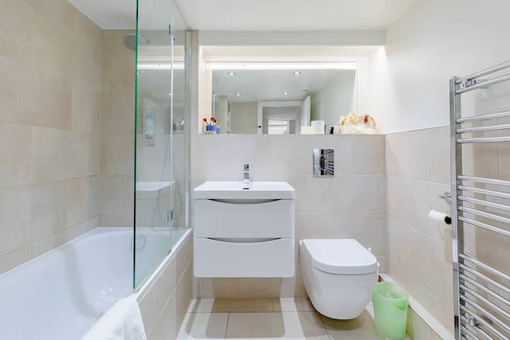 La salle de bain principale est également en bas et a été récemment rénovée, avec des carreaux neutres apaisants pour une sensation de spa. Il y a une grande baignoire avec une douche, un coin pour les articles de toilette et un porte-serviettes chauffant pour plus de confort. Un miroir lumineux moderne complète l'espace, ainsi que des articles de toilette gratuits pour que vous puissiez voyager un peu plus léger.