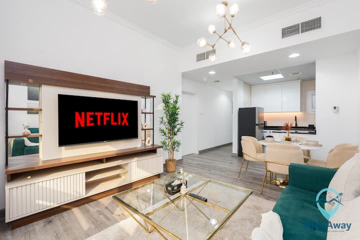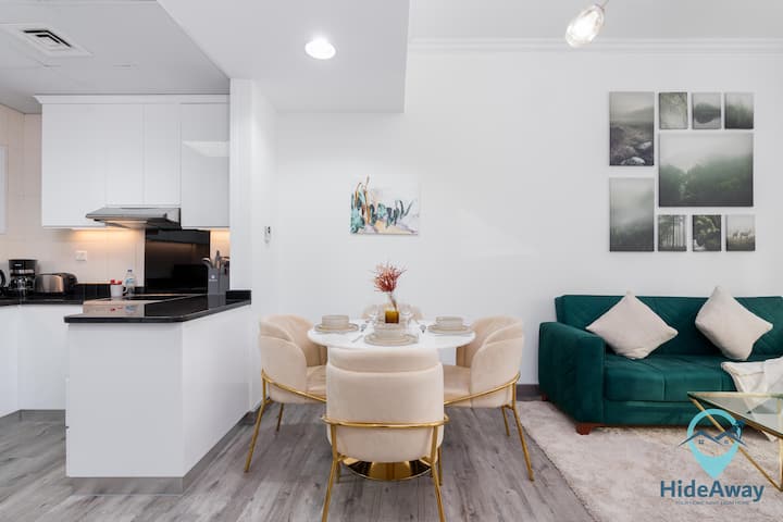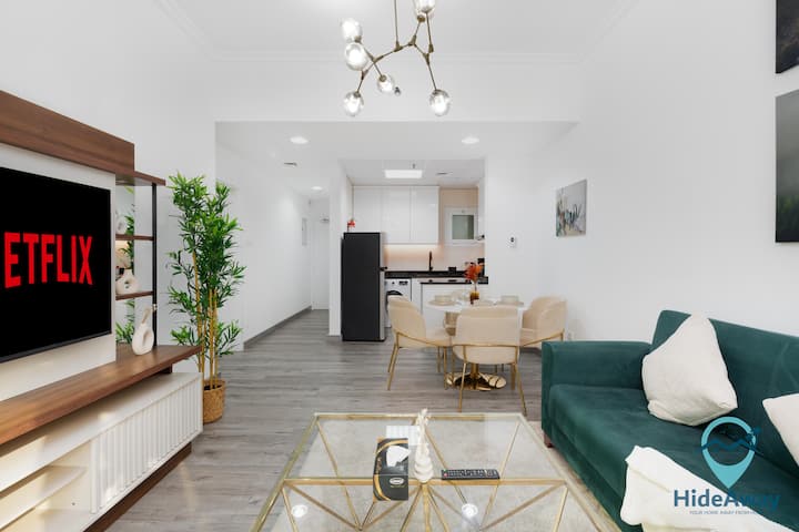 Élégant 1 chambre dans JLT à quelques pas du métro DMCC! ✨ Élégamment meublé avec une chambre spacieuse (lit queen size + salle de bain attenante), salle de bain pour les invités et couchage flexible pour jusqu'à 5 personnes (canapés-lits inclus). Détendez-vous avec une télévision intelligente de 55 po, profitez de la cuisine moderne avec machine à café et restez connecté avec une connexion Wi-Fi rapide. Avantages du bâtiment : piscine, gym, sécurité 24 h/24 et 7 j/7. À quelques minutes à pied des cafés, des boutiques et de la marina de Dubaï. Parfait pour les familles, les voyageurs d'affaires ou les séjours longue durée.