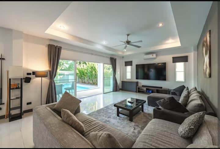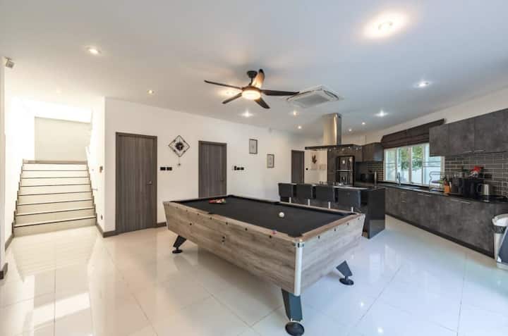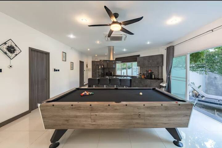 Villa 🌴 familiale de 4 chambres dans le calme Rawai avec piscine privée, jardin, barbecue et salle à manger extérieure. Capacité d'accueil de 9 personnes avec des lits « king size », un lit simple et 4 salles de bain (3 avec salle de bain attenante, une principale avec baignoire). Table de billard, télévision 86 po + Dolby Atmos, Netflix, livres, jeux et Wi-Fi. Cuisine européenne moderne, buanderie, grande allée et balcons. À quelques minutes des plages de Rawai et Nai Harn, des boutiques et des cafés, parfait pour les familles et les groupes recherchant confort, intimité et commodité.