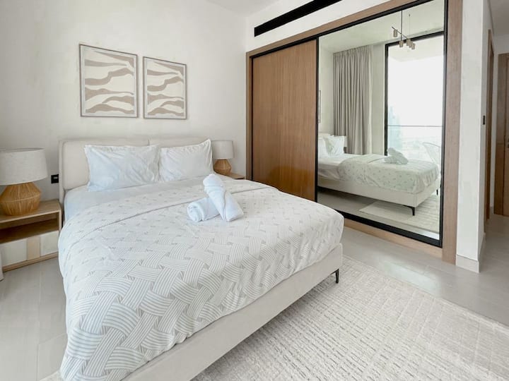Un sanctuaire reposant avec un lit queen, des draps élégants, des tables de chevet avec des lampes chaudes et une grande armoire avec des portes coulissantes en miroir. L'accès direct au balcon améliore la sensation d'air et de luminosité.