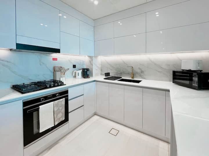 Cet appartement d'une chambre à Binghatti Lavender allie élégance moderne, tons neutres apaisants et textures douces. Le salon ouvert est doté d'un mobilier contemporain, de touches de bois et de lumière naturelle provenant de grandes baies vitrées. Une cuisine élégante avec des finitions en marbre complète la salle à manger chaleureuse, tandis que la chambre offre une retraite sereine avec une literie somptueuse et un accès au balcon. Avec 1,5 salles de bain élégantes, ce logement promet confort et fonctionnalité pour votre séjour à Dubaï.