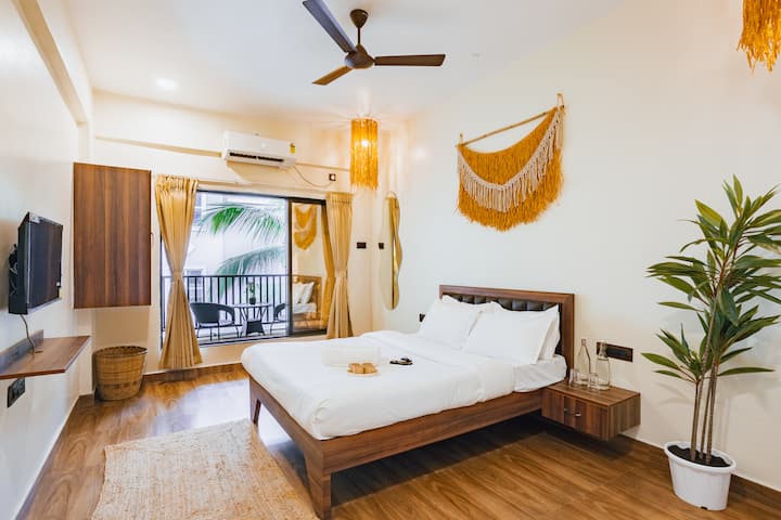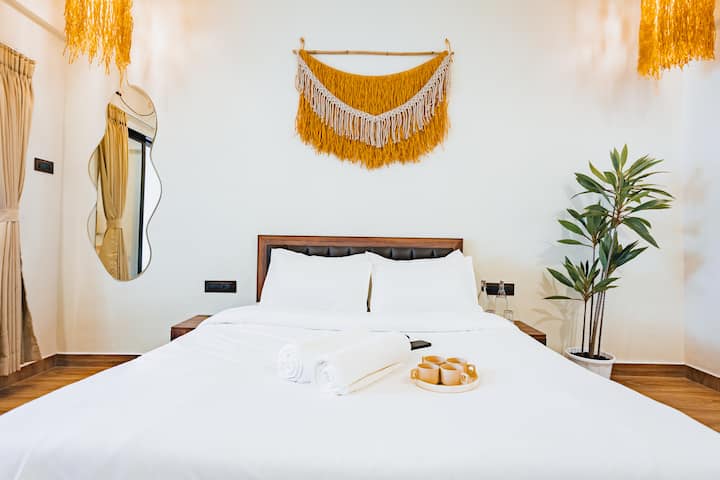 Cette chambre magnifiquement conçue offre une ambiance chaleureuse et esthétique avec des intérieurs confortables qui vous font vous sentir comme à la maison. Que vous soyez un couple en escapade de fin de semaine ou un voyageur solo à la recherche d'un séjour élégant, cette chambre est conçue pour le confort et la détente. Cette chambre dispose d'un lit queen-size, de la climatisation, d'une télévision, d'une salle de bain attenante et d'une armoire compacte.