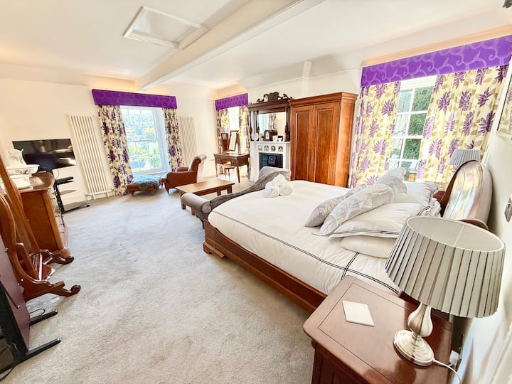 • Une suite parentale palatiale, avec une fenêtre de style géorgien encadrant les vues, et une salle de bains privative luxueuse avec une baignoire centrale à griffes (parfaite pour se baigner tout en admirant), ainsi qu'une douche double à l'italienne
