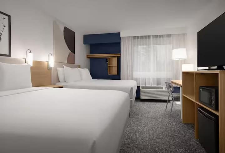 Vous voyagez avec des amis ou de la famille ? Cette chambre queen size avec deux lits Queen Size est votre zone prête à dormir. Avec un espace pouvant accueillir jusqu'à 4 personnes, il dispose de deux lits queen size confortables, de rideaux occultants et d'un téléviseur HD 50"prêt à la diffusion en continu. Gardez vos boissons au frais dans le mini-réfrigérateur et préparez-vous avec tout le nécessaire : fer, sèche-cheveux, Wi-Fi et café dans le hall à la pression. Que vous soyez en ville pour un concert, un match ou une escapade d'un week-end, c'est votre siège social.