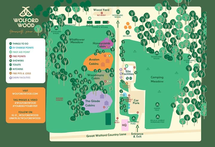 Nous voulons que vous profitiez de tout ce que Wolford Wood a à offrir, tout en assurant la sécurité de tous et en respectant notre logement. Les propriétaires vivent sur place, alors n'entrez pas dans les portes de la grande maison rose, car ils ont des chiens. Pour la sécurité de tous, veuillez également rester à l'écart des champs de chevaux et de la cour à bois, qui est une zone de travail.