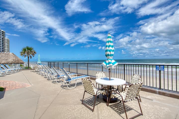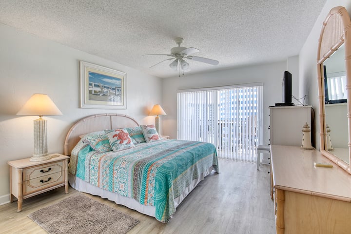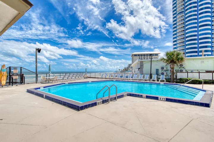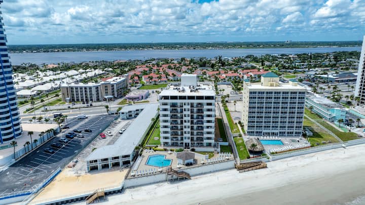 Bienvenue à la plage s'il vous plaît ! Piscine incluse — un condo amusant et aéré de 2 chambres et 2 salles de bain à Daytona Beach Shores. Située au 7ème étage, cette retraite offre une vue latérale sur l'océan Atlantique et Intracoastal depuis votre balcon privé. Profitez d'une piscine en bord de mer, d'un sauna, d'un espace fitness et d'un accès direct à la plage. Pour 6 personnes avec lit King Size, lits jumeaux et canapé-lit. Parking couvert, laveuse sécheuse et cuisine entièrement équipée incluses pour le séjour côtier ultime.