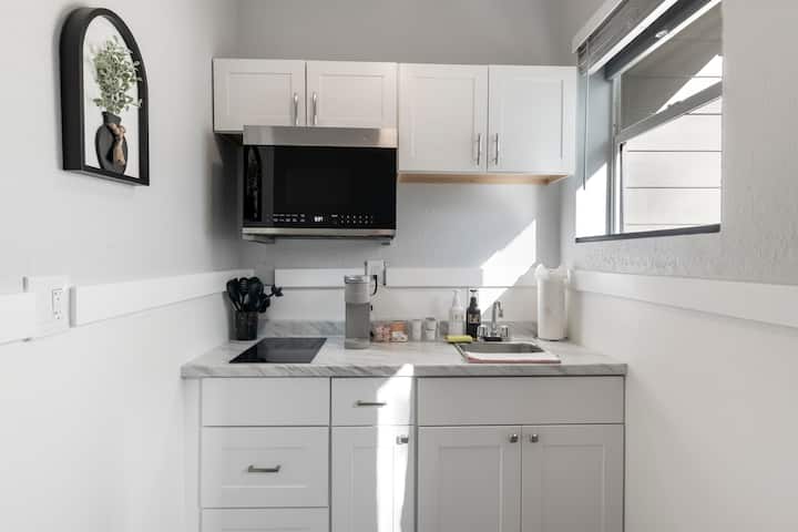 Cuisine moderne✹ entièrement équipée avec électroménagers en acier inoxydable et bar à café