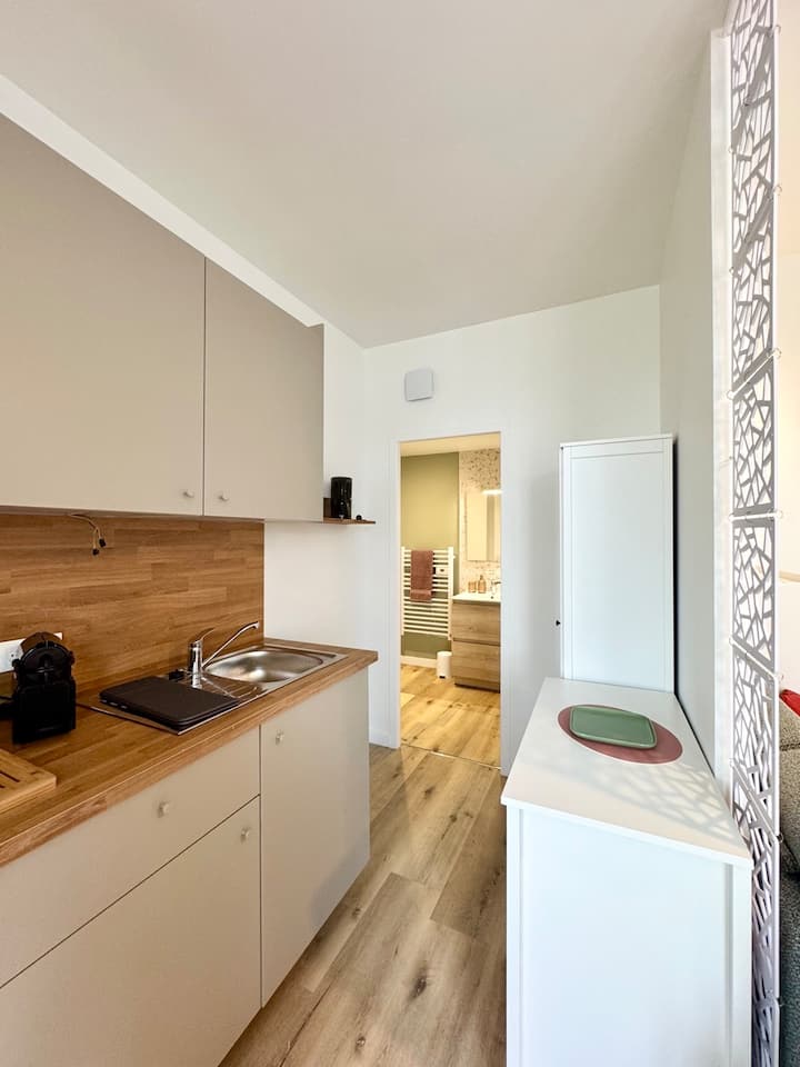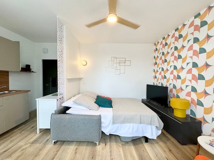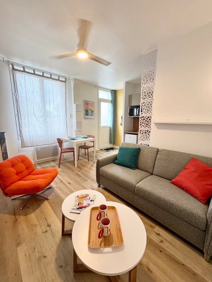 Installez-vous dans notre studio cosy de 25 m², idéalement situé en plein centre-ville de Mont-de-Marsan. Entièrement rénové et repensé par une architecte d’intérieur, cet espace moderne et vitaminé a été optimisé pour vous offrir un séjour confortable, que ce soit pour des vacances ou un déplacement professionnel.