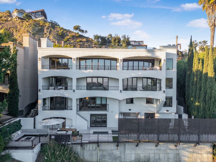 Perché sur les hauteurs de Hollywood Hills, le long de l'emblématique Mulholland Drive, ce domaine méditerranéen contemporain sécurisé redéfinit le luxe avec une vue imprenable sur la ligne d'horizon de Los Angeles.
