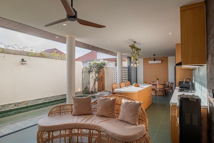 Bienvenue à Villa Bloom, une villa privée moderne et confortable de 2 chambres avec d'élégants accents de pierre naturelle, un espace de vie intérieur-extérieur transparent et une terrasse tranquille sur le toit avec une vue paisible sur les rizières. Située à Babadan, entre Pererenan et Munggu, la villa offre une commodité incroyable — à proximité des plages, des cafés branchés, des gymnases, des restaurants, des magasins et de la vie nocturne — tout en étant nichée dans un quartier calme où vous pourrez profiter de la nature, des matins tranquilles et d'une détente totale.
