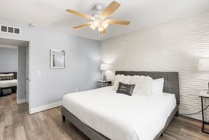 Sortez par la porte d'entrée et vous trouverez une charmante cour avec une piscine chauffée, visible directement depuis la chambre principale. La chambre principale comprend un lit king size moelleux, un ventilateur de plafond, un placard spacieux et un éclairage de chevet pour que vous vous sentiez comme chez vous.