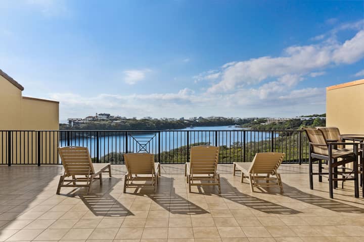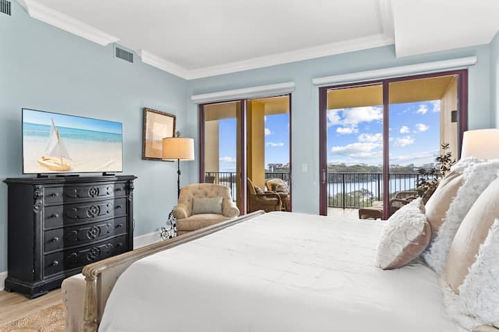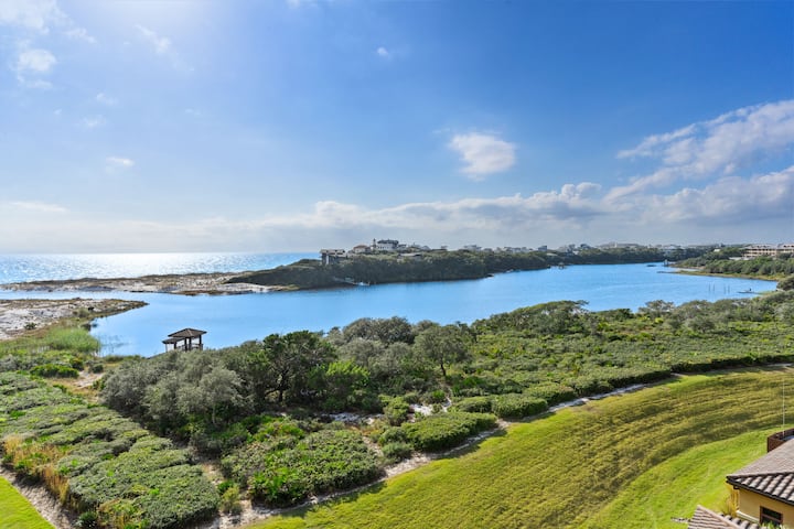 Perché au dernier étage du Sanctuary by the Sea, ce magnifique condo de deux étages, quatre chambres et quatre salles de bain et demie offre une vue spectaculaire sur le golfe et un paysage serein au bord du lac. Pouvant accueillir jusqu'à dix voyageurs, elle allie sophistication moderne et charme côtier décontracté, ce qui en fait la retraite idéale pour les familles ou les groupes à la recherche de style et de confort.